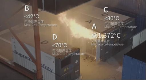 燃烧试验开始,通过人为加热预制舱集装箱A内的8颗电芯引发热失控,并导致电池间发生热失控传播,待电池包泄压口打开后,利用点火系统进行引燃触发。触发预制舱箱门保持开启,充分与氧气接触,所有电池包均充分燃烧,向相邻预制舱集装箱B、C、D的热传递得以实现最大化 。